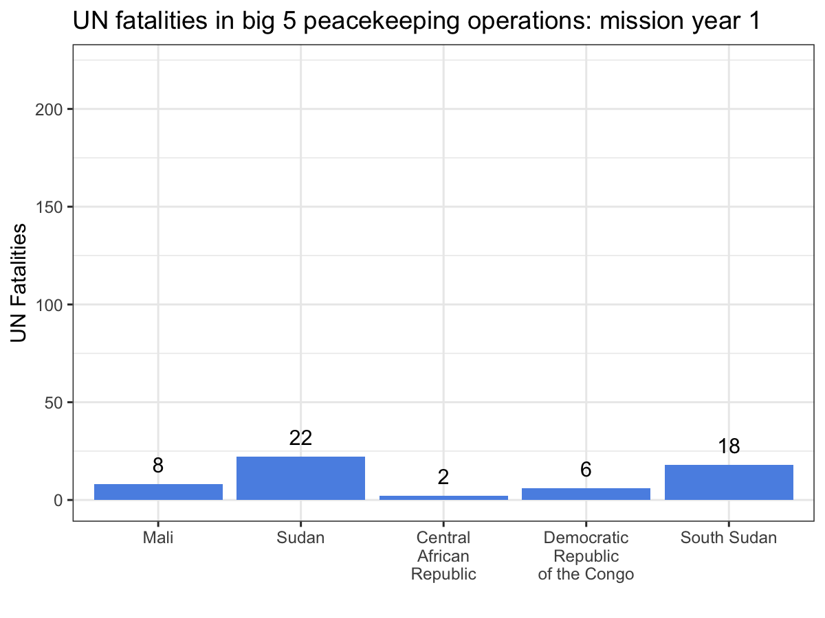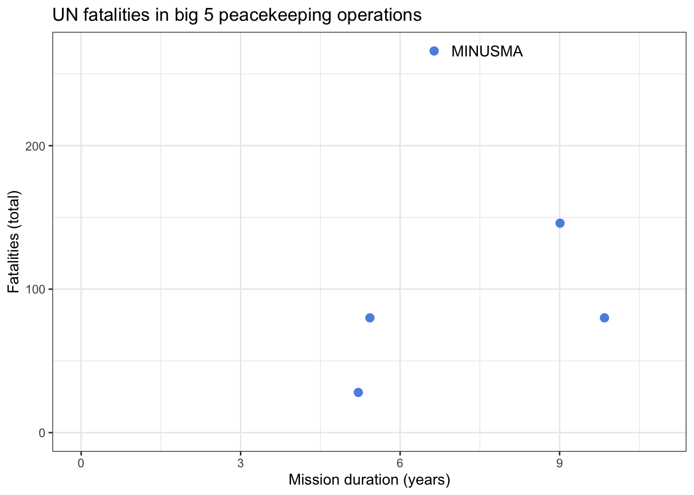 Some coauthors and I recently published a piece in the Monkey Cage on the recent military coup in Mali and the overthrow of president Ibrahim Boubacar Keïta. We examine what the ouster of Keïta means for the future of MINUSMA, the United Nations peacekeeping mission in Mali. One of my contributions that didn’t make the final cut was this plot of casualties to date among UN peacekeepers in the so-called big 5 peacekeeping missions .