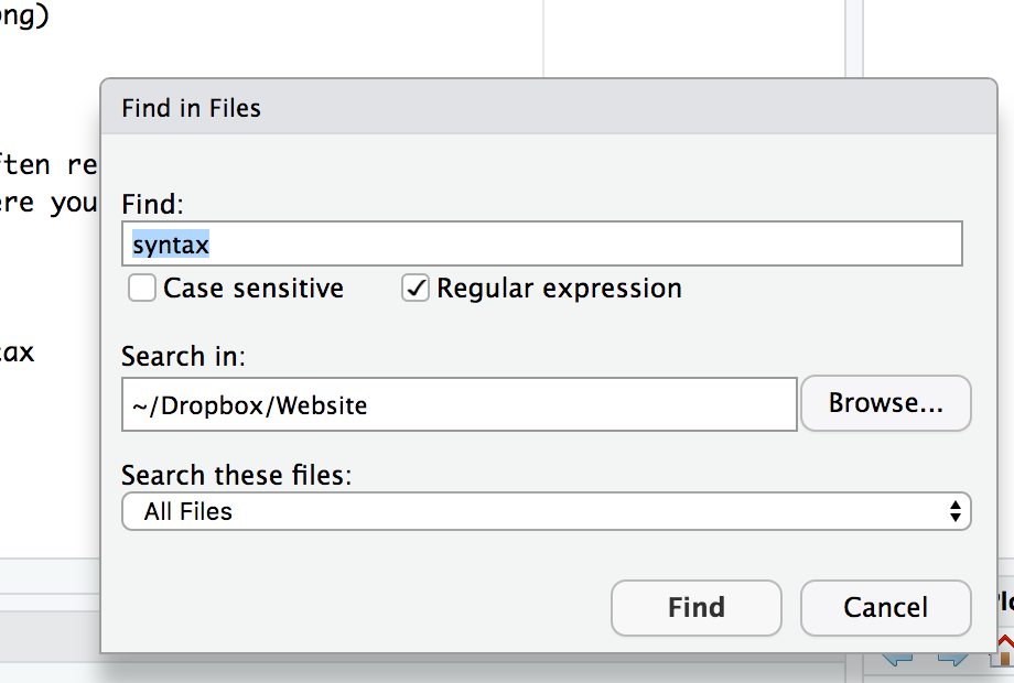 Essentially, you need to track down where in the source code of your website a variable is originally defined, and then edit it there. Luckily, RStudio makes this relative straightforward with its Find in Files function. You can access this special search from the Edit menu, or by pressing Cmd+Shift+c on MacOS or Ctrl+Shift+c otherwise. Once you’ve brought up the Find in Files dialog, enter the name of the variable you’re looking for in the ‘Find’ box and your website’s directory in the ‘Search in’ box (for me that’s ~/Dropbox/Website).